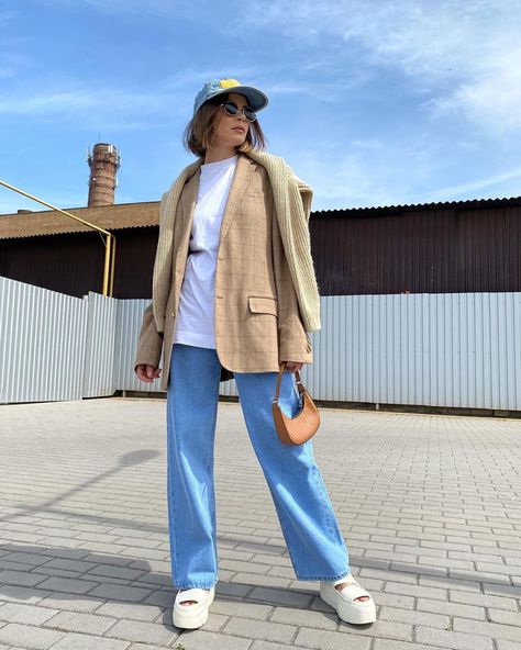 Скомбинируйте джинсы с белой футболкой, пиджаком и свитером (его можно накинуть сверху – как показано на фото). Добавьте спортивную обувь, головной убор, сумочку и солнцезащитные очки (по желанию).