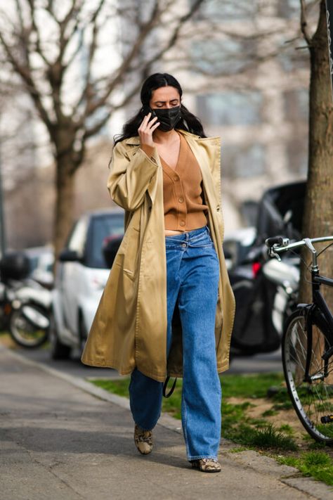 Широкие джинсы также можно обыграть следующим образом: кардиган, тренч, каблуки и, собственно, сами джинсы. Осталось только распустить волосы.