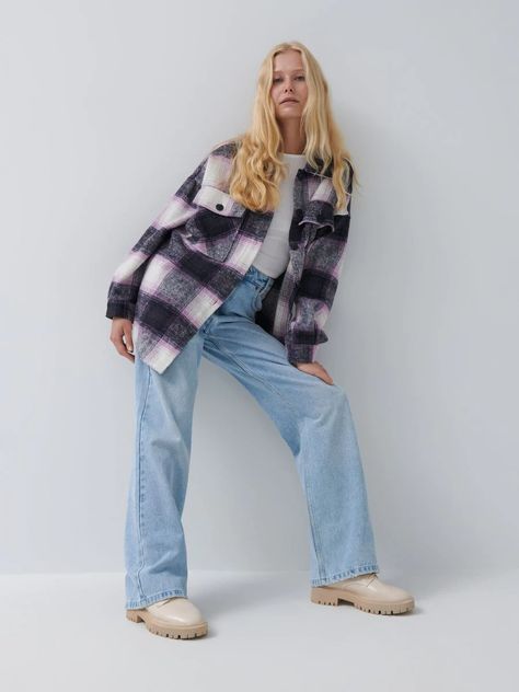 Широкие джинсы будут хорошо смотреться в сочетании с рубашкой в клетку. К основным вещам останется добавить подходящую обувь и базовую белую майку.