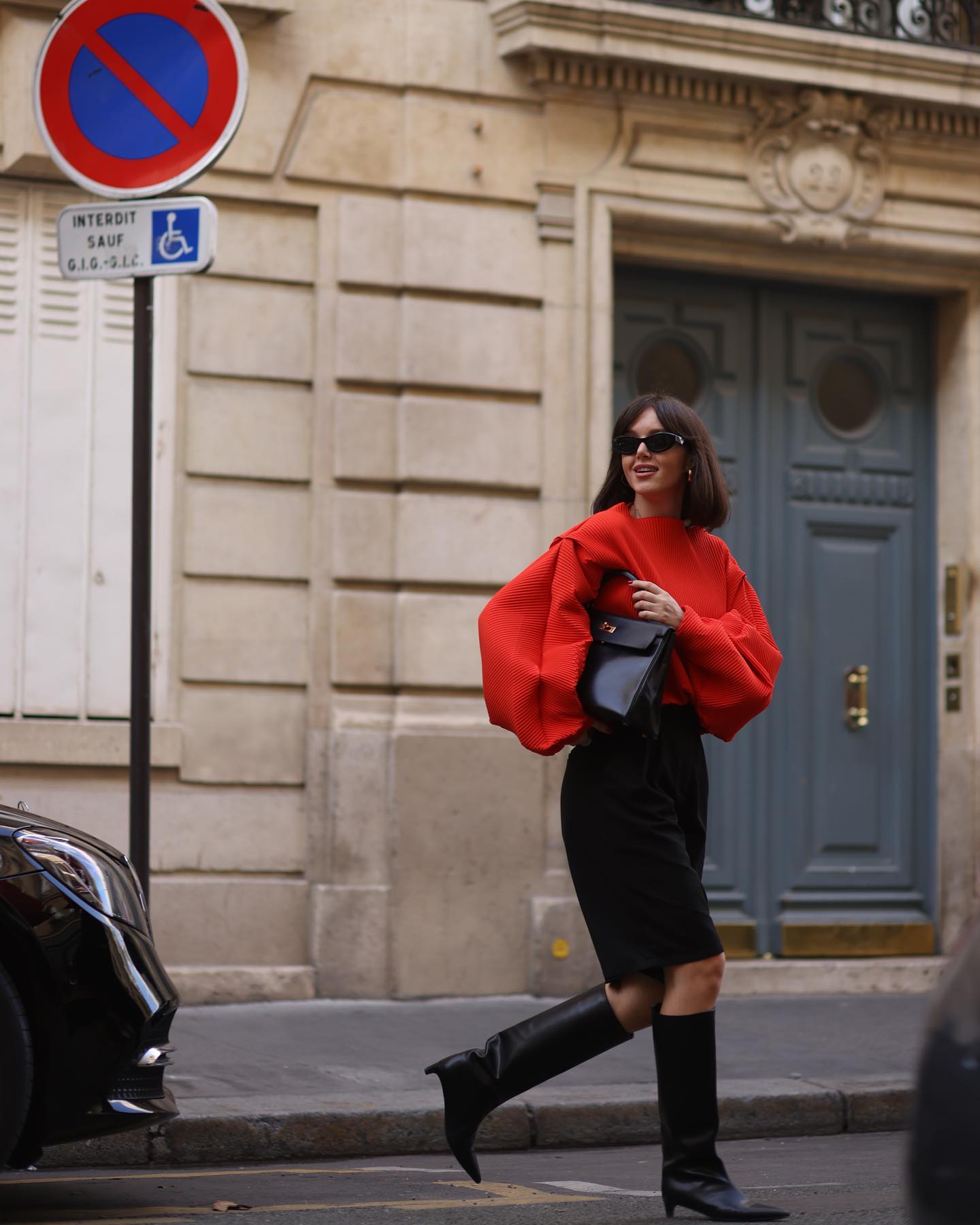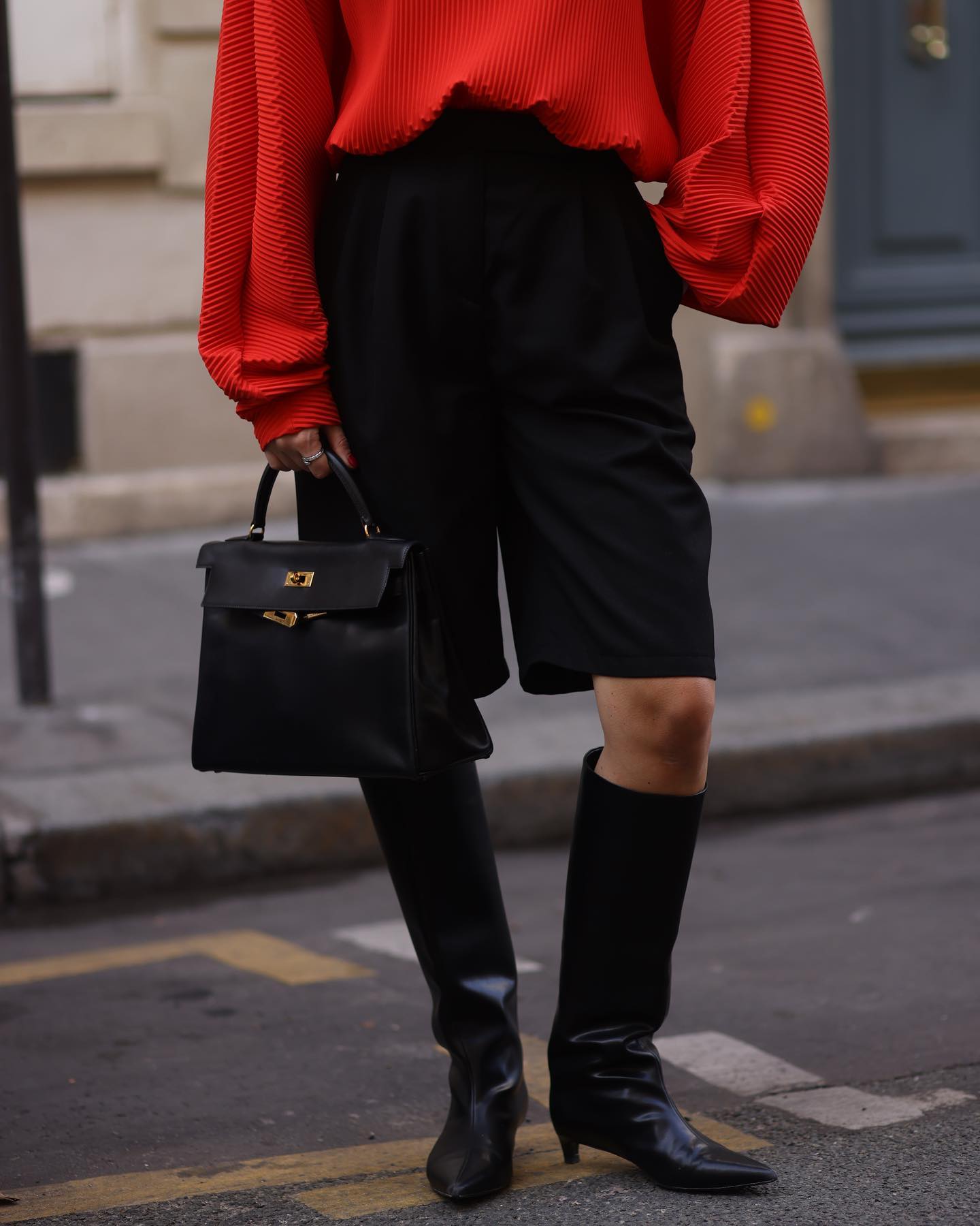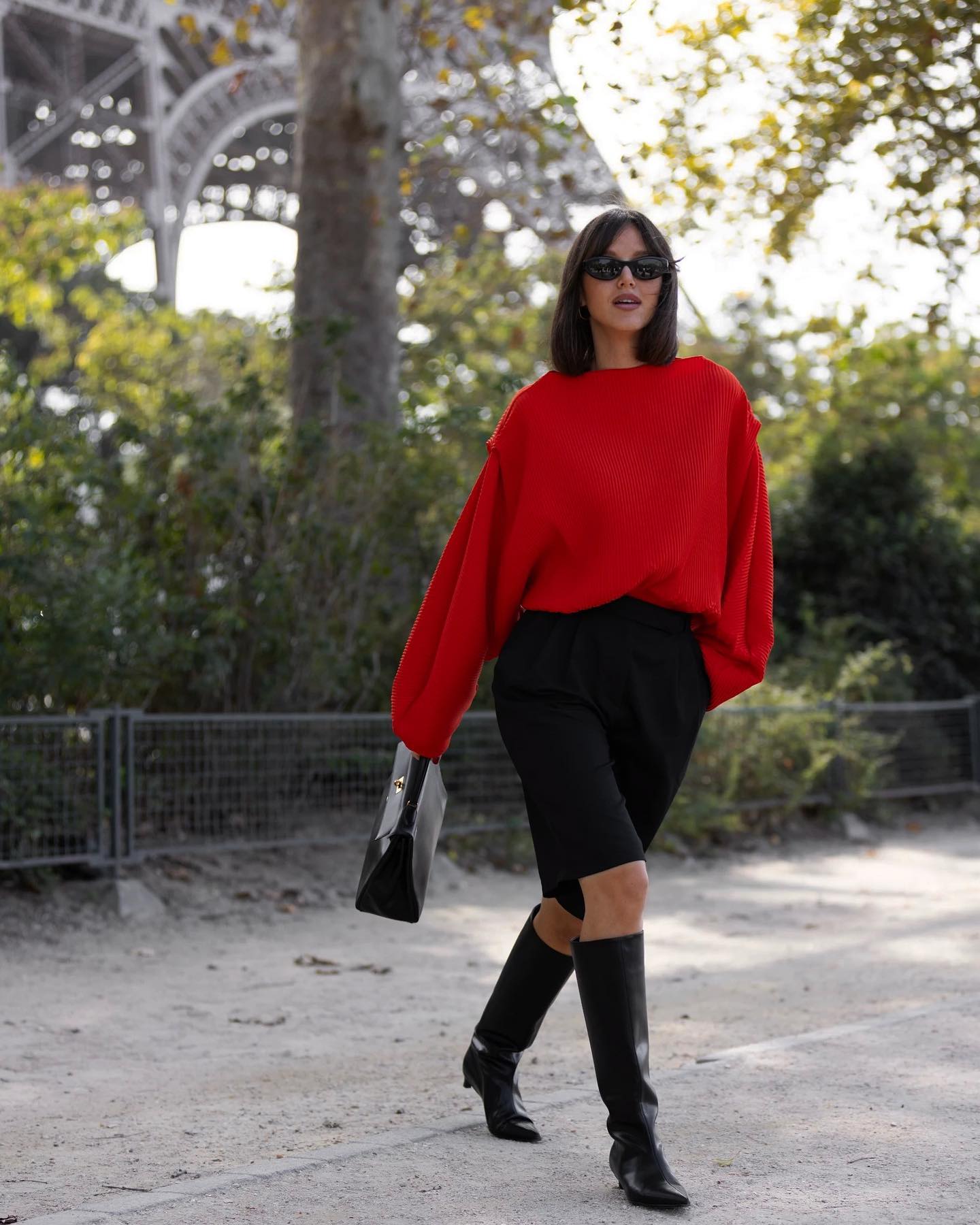 Фэшн-блогер из Тернополя, предприниматель и основатель собственного бренда Алина Френдий на своей странице в соцсети Instagram продемонстрировала стильный осенний лук с сапогами в стиле 1980-х. Для прогулки она выбрала черные шорты-бермуды длиной до колена, ярко-алую блузу с объемными рукавами и сапоги с широким голенищем и "кошачим каблуком". Свой образ она дополнила классической кожаной сумкой.