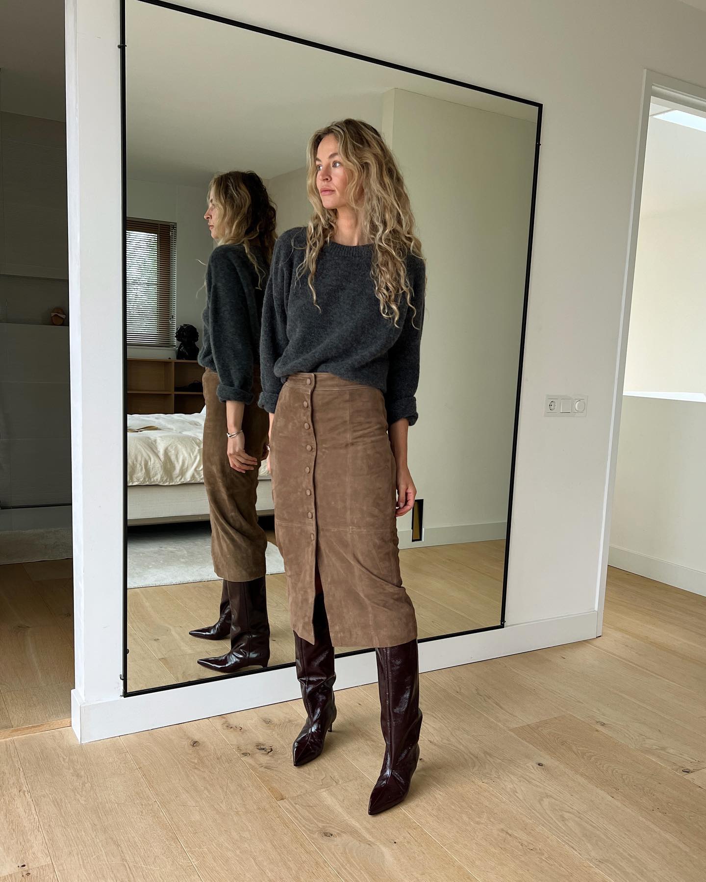 Такая пара обуви есть и у известного блогера Анук Ив, образами и умением экспериментировать со стилем которой вдохновляются более 1 млн подписчиков в Instagram. Для повседневного лука она выбрала лакированные сапоги с острым носком и широким голенищем. Их она надела с замшевой юбкой миди, декорированной небольшими пуговицами спереди, а также с базовым серым свитером, который Анук Ив заправила в юбку. Дополнила образ небольшая сумка-клатч через плечо.