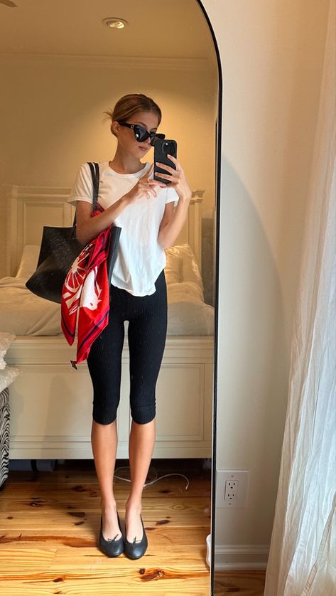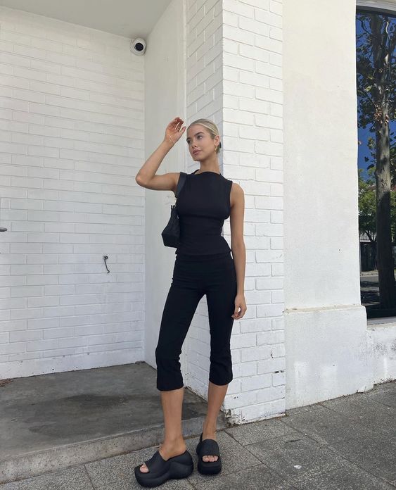 Также можно создать образ в одном цвете, например, в черном. Для этого просто соедините капри с топом и подходящей обувью.