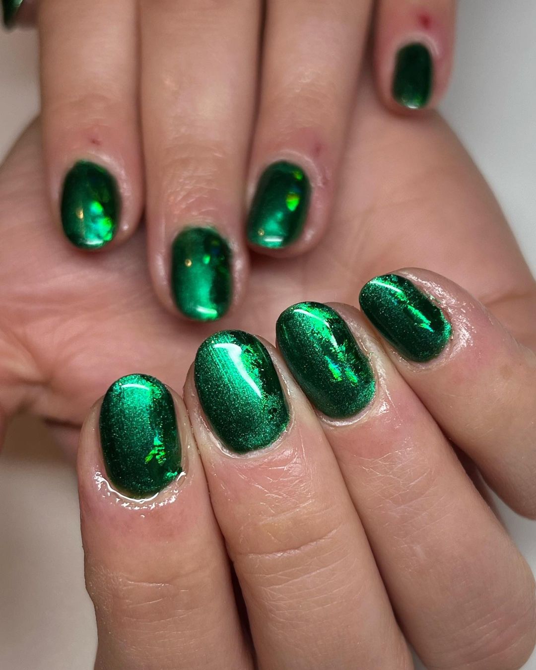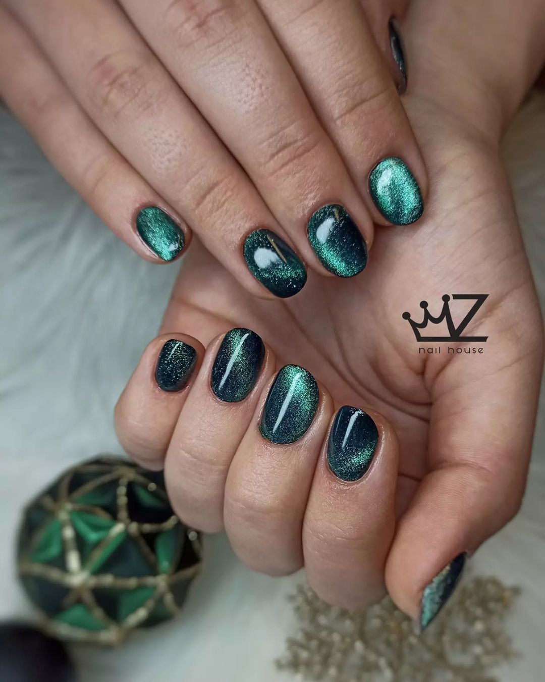 Еще один вариант маникюра на Новый год 2023 – магнитный изумрудного цвета. Это дизайн делают с помощью магнита, воздействующего на металлические частицы в лаке для ногтей. Ногтевая пластина покрывается прозрачной базой, затем фоновым оттенком (по желанию) и магнитным лаком. Потом с помощью магнита можно создать самые разнообразные рисунки, в том числе с 5D-эффектом. Магнитный маникюр также часто называют "cat eye" или же "кошачий глаз". Он получил свое название благодаря сильному сходству с драгоценным камнем – хризобериллом.