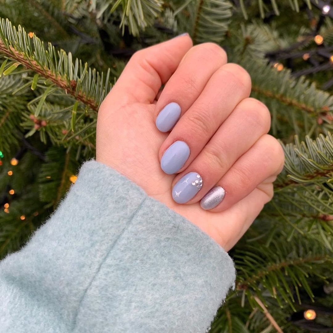 Также можно совместить в одном дизайне несколько цветов и дизайнов. Например, покрыть основную часть синим гель-лаком и поверх нанести мелкие блестки. Один ноготь сделать белого цвета и украсить его стемпингом со снежинками.