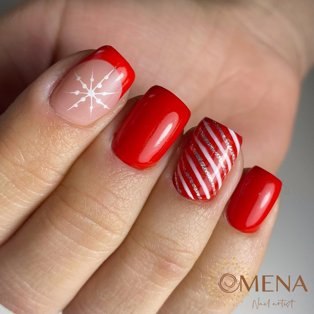 У многих модниц новогодний маникюр ассоциируется с алым оттенком лака. Можно сделать однотонный маникюр в таком цвете или же разнообразить его дизайнами: на одном ногте – оригинальный френч с красным кончиком и стемпингом в виде снежинки, а на другом – полосатый дизайн, чередуя красный, серебристый и белый цвета.