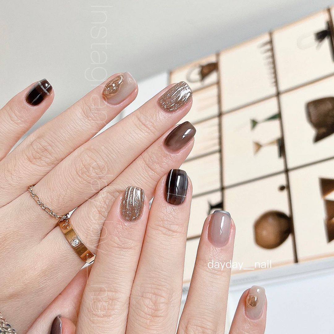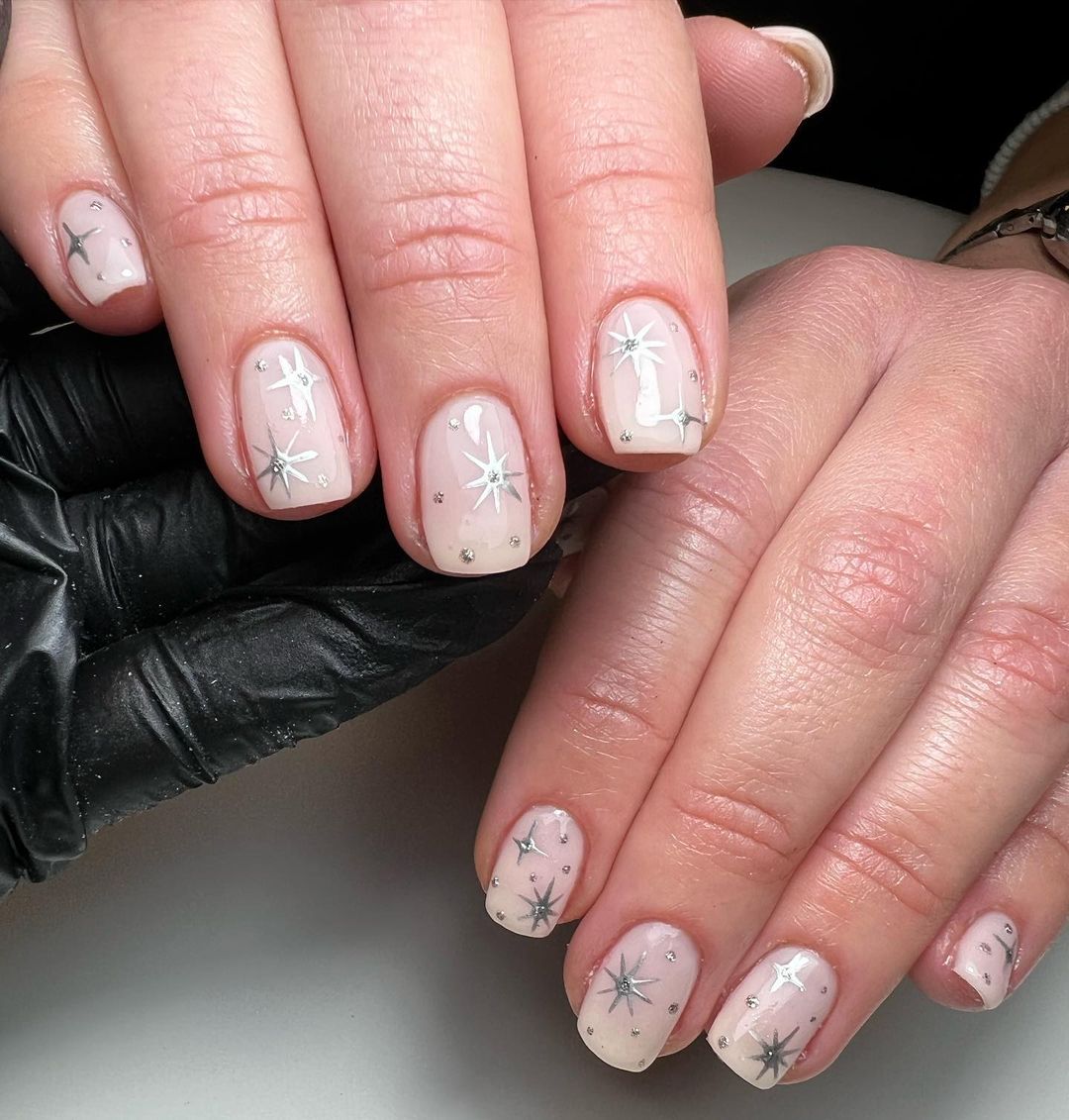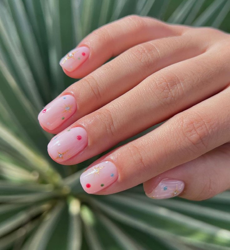 Еще один дизайн на короткие ногти – с полупрозрачным покрытием. Нанесите любой оттенок и украсьте разноцветными точками и рисунками звезд или снежинок.
