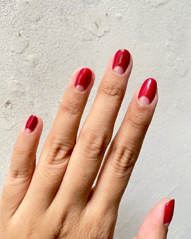 Еще один вариант в красном цвете – лунный маникюр. В этом случае акцент делается на луночке ногтя – ее можно выделить другим цветом или оставить с прозрачным покрытием.