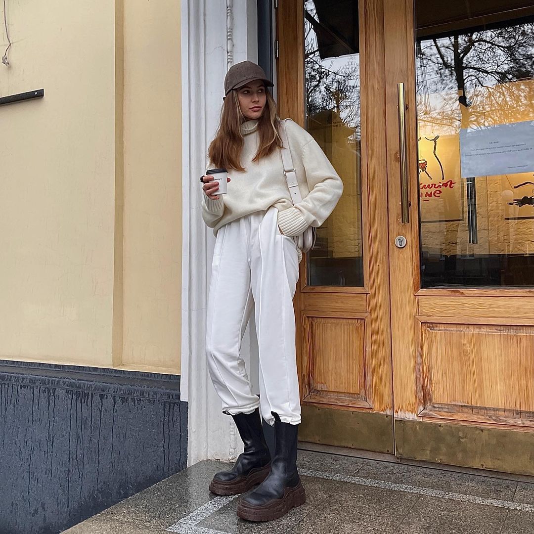 На первую половину осени присмотрите теплую кепку – с таким аксессуаром можно создать образы в стиле кэжуал. Надевайте любимые спортивные штаны, короткий свитер или водолазку и кожаную куртку-косуху. Дополните лук грубыми ботинками, а также аксессуарами – кепкой и небольшой сумкой.