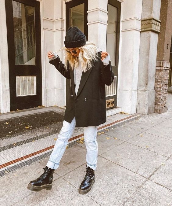 Для повседневных образов выбирайте шапку бини – это головной убор, плотно прилегающий к голове, может быть как с помпоном, так и без него. Надевайте теплый спортивный костюм, парку и дополните лук такой шапкой. Еще один вариант лука: голубые джинсы, свитер, массивный пиджак и ботинки-"мартинсы".