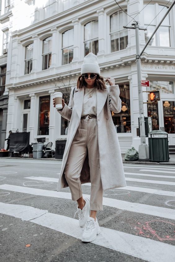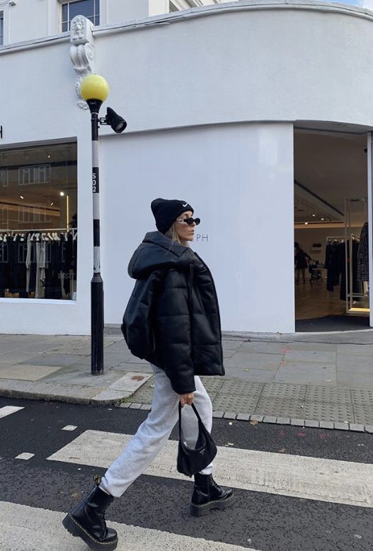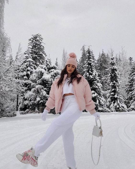 Если вы не боитесь выделяться из толпы, подберите вязаную шапку с помпоном. Надевайте спортивные брюки, теплый свитер, короткий пуховик и ботинки на массивной подошве или утепленные кроссовки. Свой лук дополните такой шапкой и небольшим клатчем.