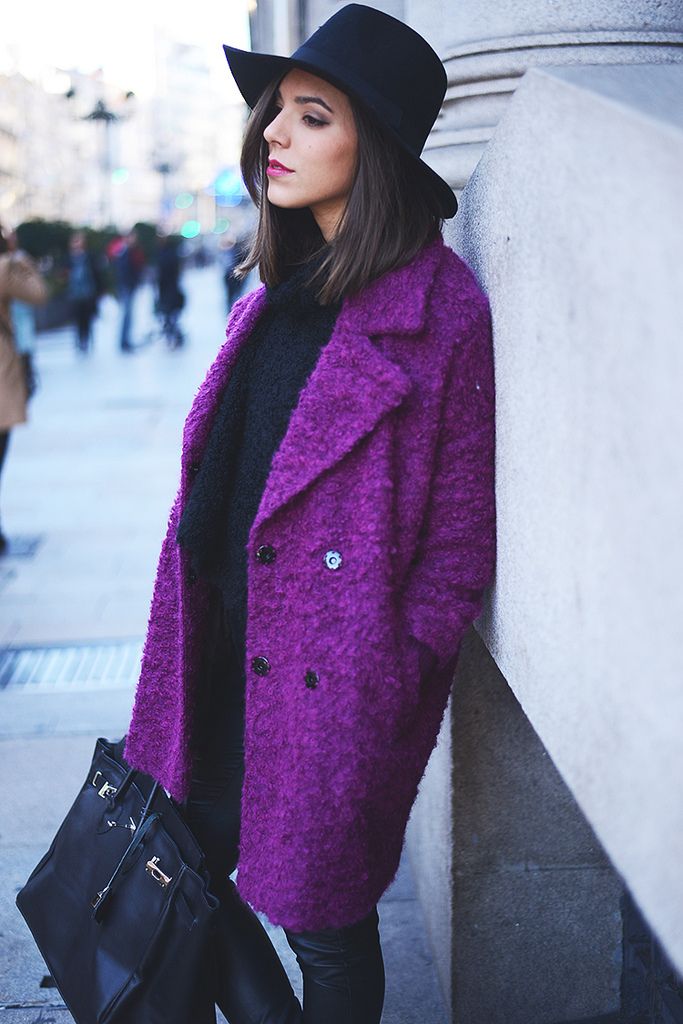 Очень трендовым в этом сезоне стал глубокий фиолетовый цвет. Он роскошно смотрится в сочетании с черной одеждой и различными шляпами. Также этот тон очень идеи брюнеткам.