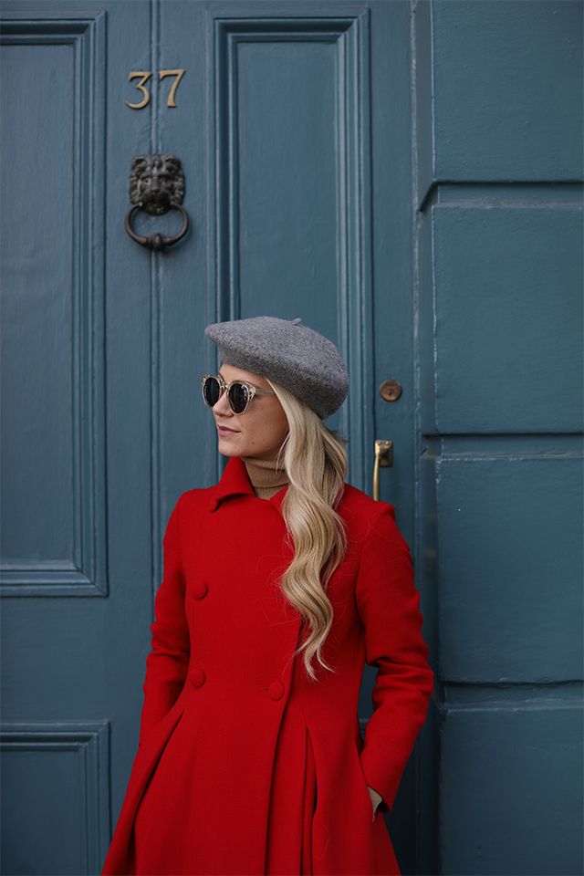Блондинкам хорошо подойдут красные пальто. Дополнить образ можно беретом или небольшой шляпкой, очками и золотыми аксессуарами.