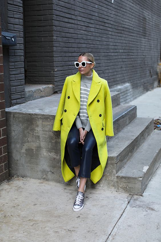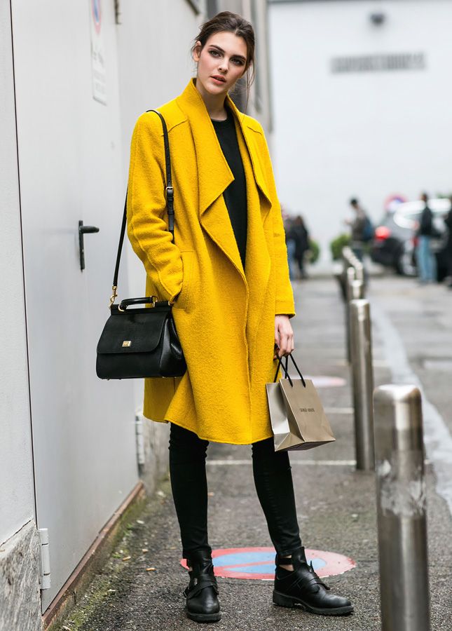 Желтое пальто идеально впишется в ваш гардероб, если вы любите модный в этом сезоне наряд All black (англ. - "Все черное"). Это яркий и необычный ход, который сразу сделает ваш образ более стильным.