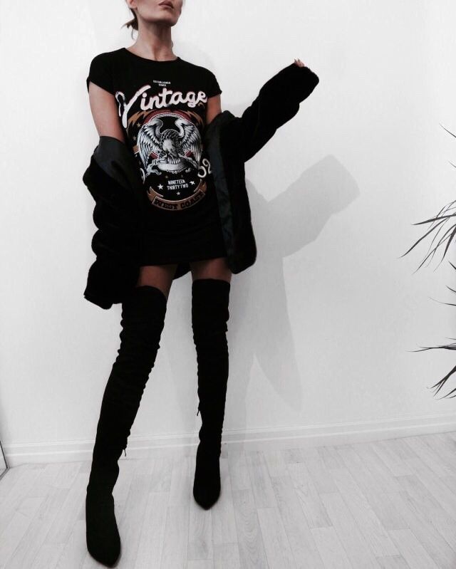 Любители дерзких неформальных образов могут сочетать сапоги с короткой черной юбкой или платьем. К такому наряду можно добавить футболку с броским логотипом, куртку оверсайз, большие аксессуары и темную помаду.
