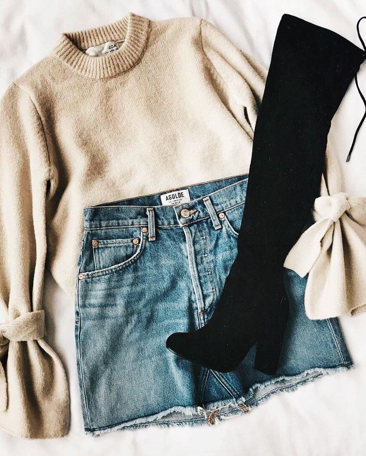 Классический кежуал-вариант - сочетание джинсовой юбки, простого однотонного свитера и сапожек чуть выше колена. Такой наряд идеально подойдет для прогулки в парке или свидания. Также можно дополнить его небольшим рюкзачком и кепкой, если вы хотите создать более спортивный лук. Или же надеть берет и взять клатч, если вам по душе элегантные образы.