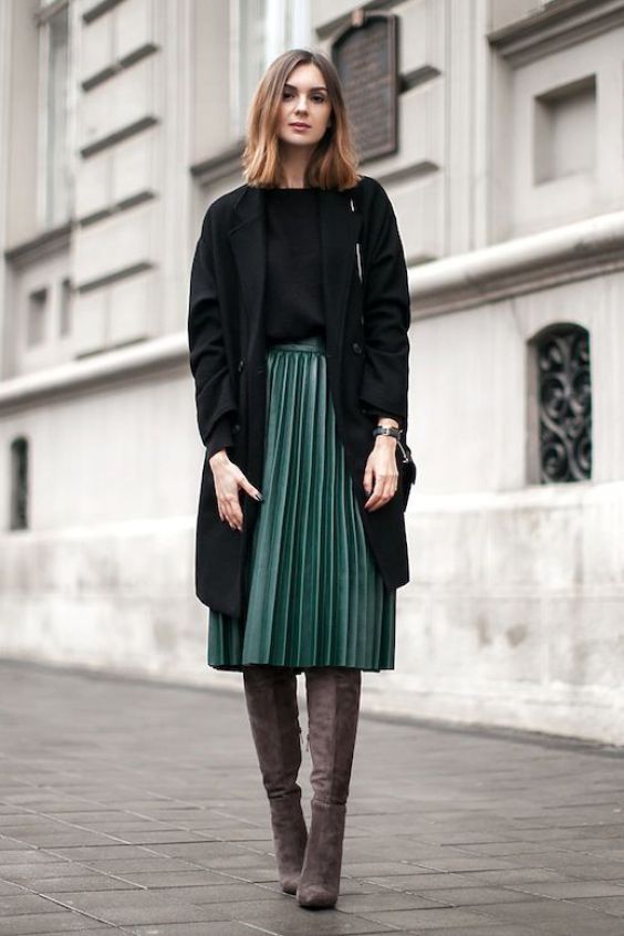 Начнем с популярных в этом сезоне юбок плиссе. Они прекрасно смотрятся в осеннем образе, особенно в сочетании с сапогами, однотонным свитером и накидкой или пиджаком. Дополнить такой наряд можно шляпкой или шапочкой бинни, сумкой в тон и нюдовой помадой.