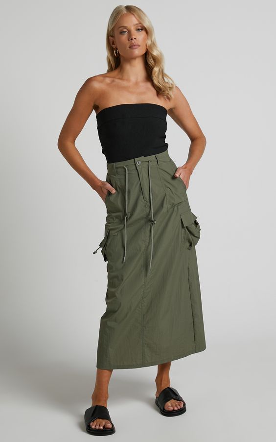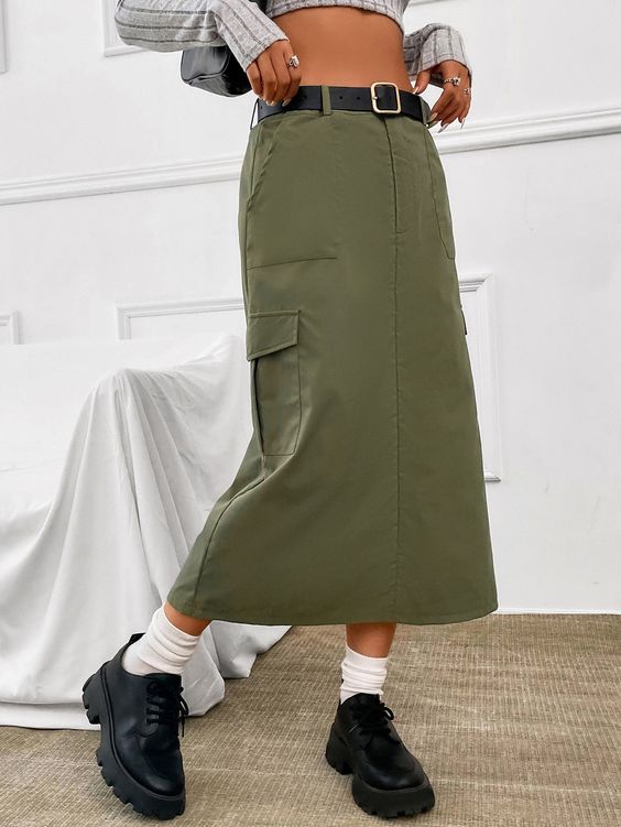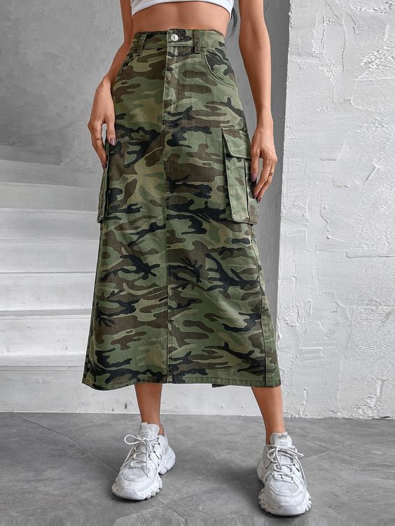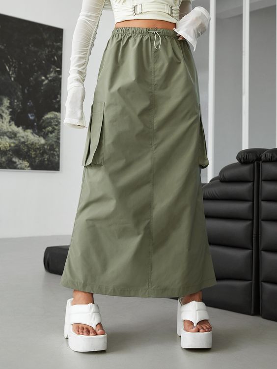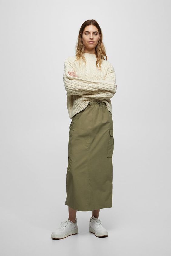 Для создания повседневного лука присмотрите длинную юбку карго с накладными карманами, однотонный свитер и удобные кеды или кроссовки. Вместо свитера в более теплую погоду можно надеть белую рубашку, топ или футболку.
