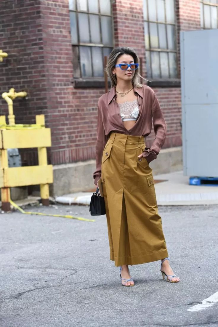 Если вы любите эксперименты, надевайте юбку карго, атласную блузу и обувь на каблуках. Дополнить образ можно маленькой сумкой-клатчем, солнцезащитными очками и украшениями.