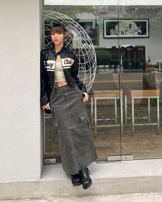 Еще один вариант – юбка карго, топ, кожаная куртка-косуха и ботинки-"мартинсы".