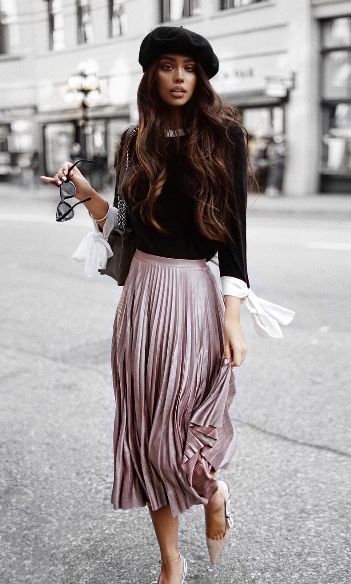 И, конечно же, нельзя не сказать про береты. Их можно носить практически с чем угодно. Например, такой головной убор будет очень хорошо смотреться с юбкой-плиссе, однотонным верхом и классическими лодочками.
