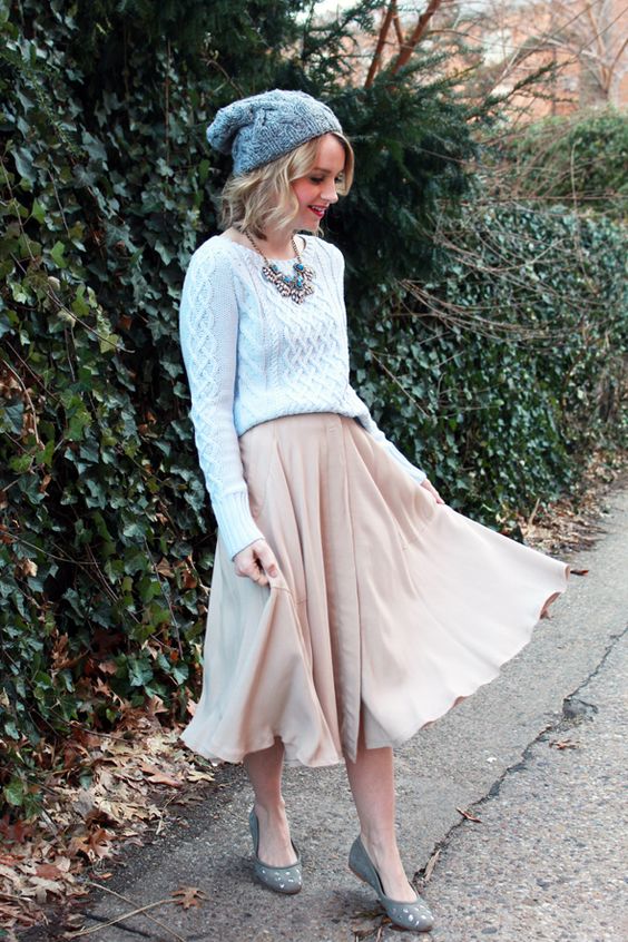Что касается эклектики, необычный и красивый ход - шапочка бини, легкий свитер и длинная воздушная юбка. Такой образ смотрится воздушным и романтичным, при этом сохраняя тепло и уют.