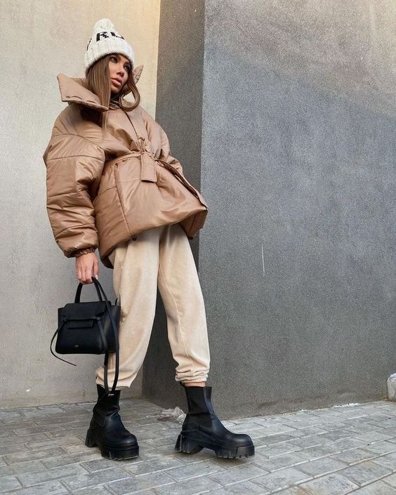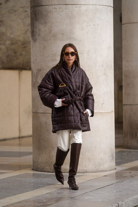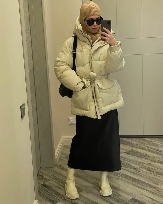 Также пуховик с поясом можно сочетать с высокими сапогами с узким носком, заправив в них брюки.