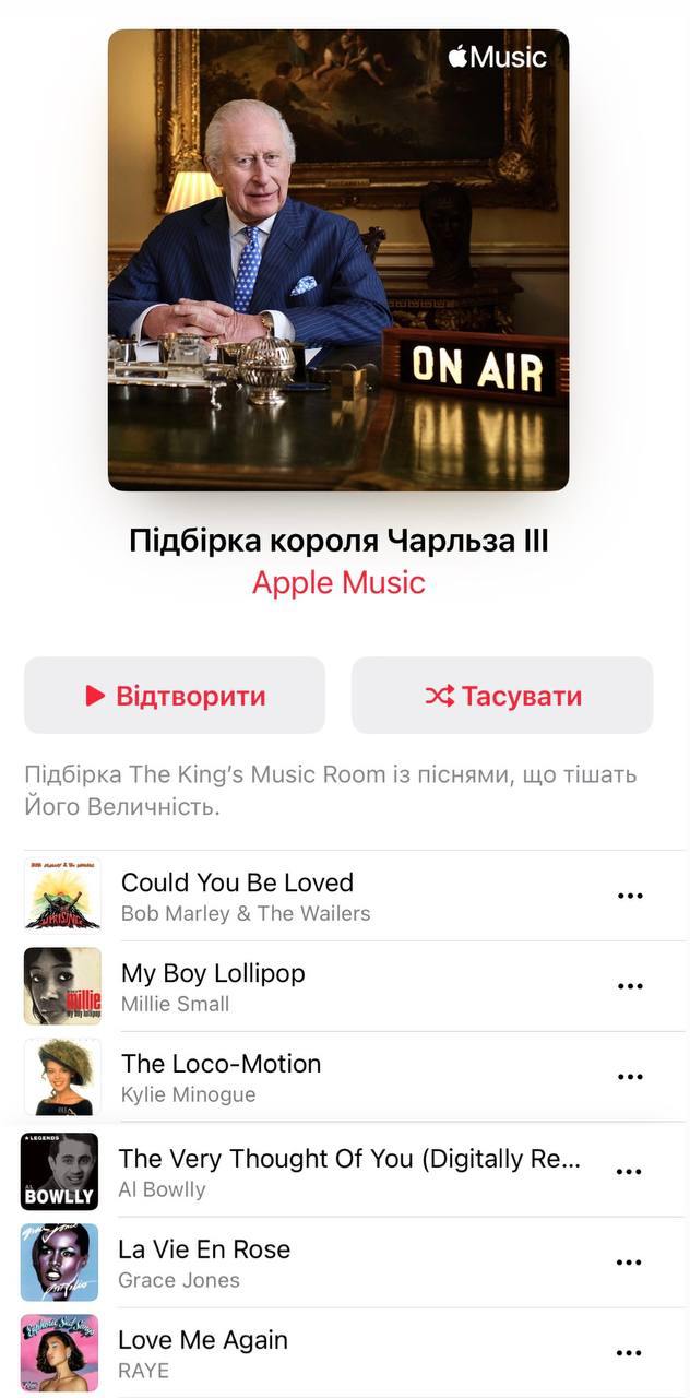 Британский король Чарльз III запускает личный плейлист с музыкой, которая поднимает ему и с которой связаны его важные воспоминания. Музыкальные предпочтения британского монарха разнообразны – от регги до диско, однако украинских исполнителей в списке нет.