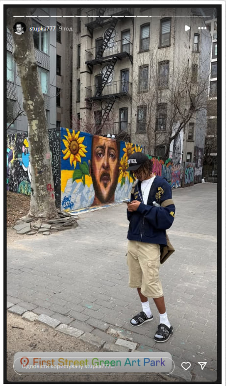 Украинский актер Дмитрий Ступка, внук легендарного актера Богдана Ступки, наткнулся в Нью-Йорке на First Street Green Art Park на мурал, где изображен президент Украины Владимир Зеленский.