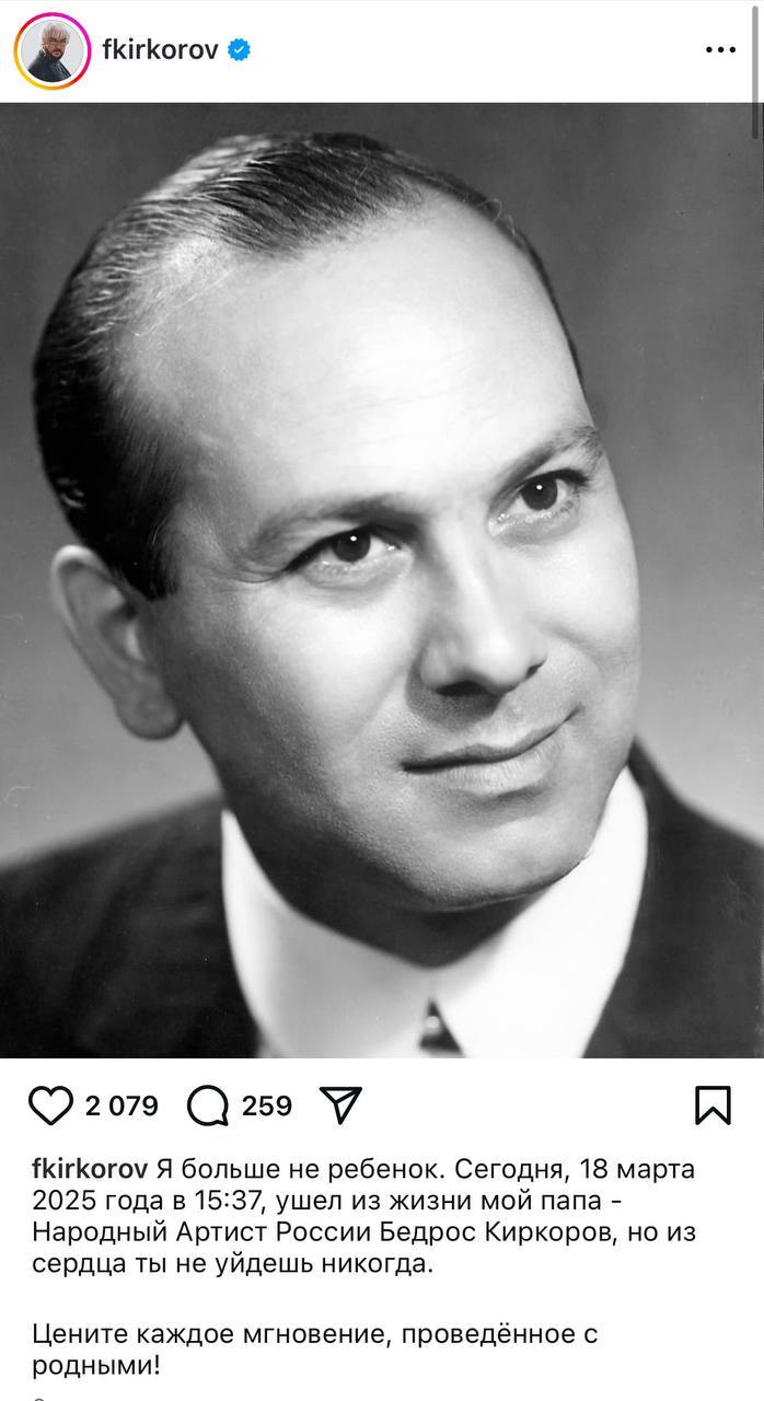 "Я больше не ребенок. Сегодня, 18 марта 2025 года в 15:37, ушел из жизни мой папа - Народный Артист России Бедрос Киркоров, но из сердца ты не уйдешь никогда", - написал артист.