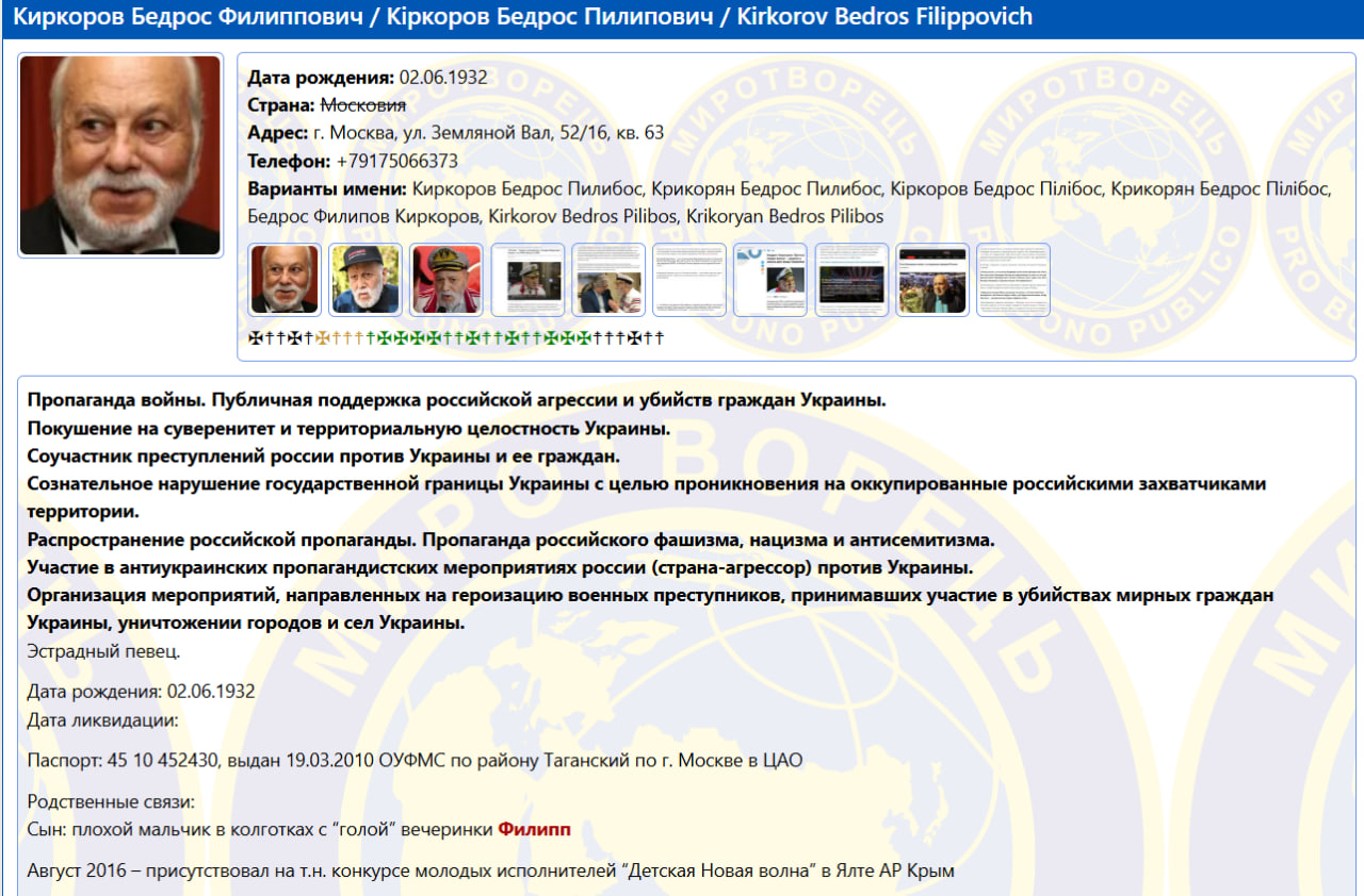 Заметим, Бедрос Киркоров занесен в базу "Миротворца". Как известно, это украинский сайт и общественная организация, исследующая признаки преступлений против национальной безопасности Украины, мира, безопасности человека и международного права. Результаты своих исследований Центр Миротворец открыто публикует на одноименном сайте.