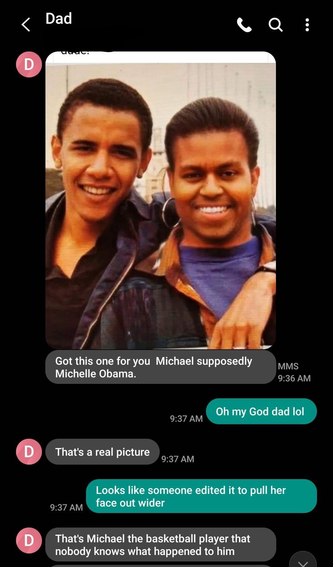 По словам парня, однажды отец показал ему это фото и рассказал историю о дружбе Барака Обамы с неким баскетболистом Микаэлем, который со временем исчез. Вскоре после этого будущий президент США якобы женился на девушке по имени Мишель.