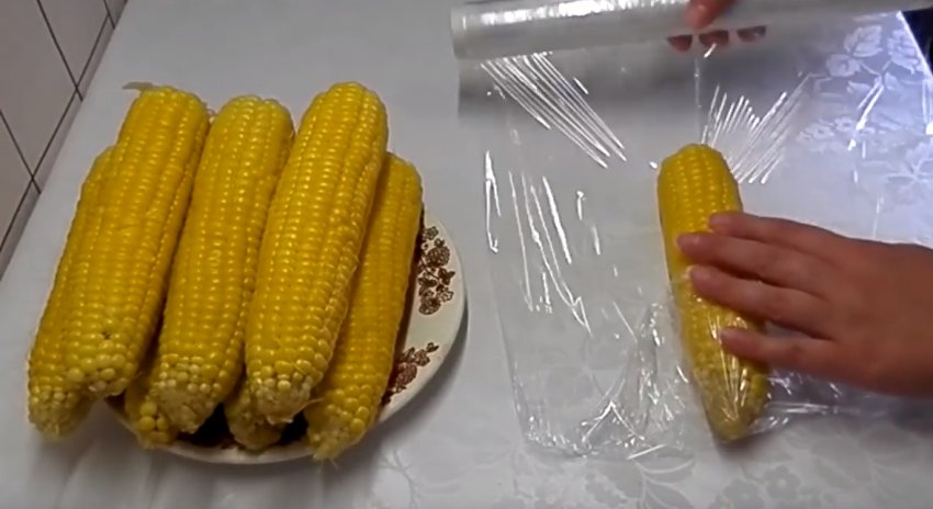 Заворачиваем каждый початок в пищевую пленку – кукуруза должна была полностью покрыта пленкой со всех сторон.Это убережет початки от заветривания и не даст им пропитаться запахами от других продуктов.