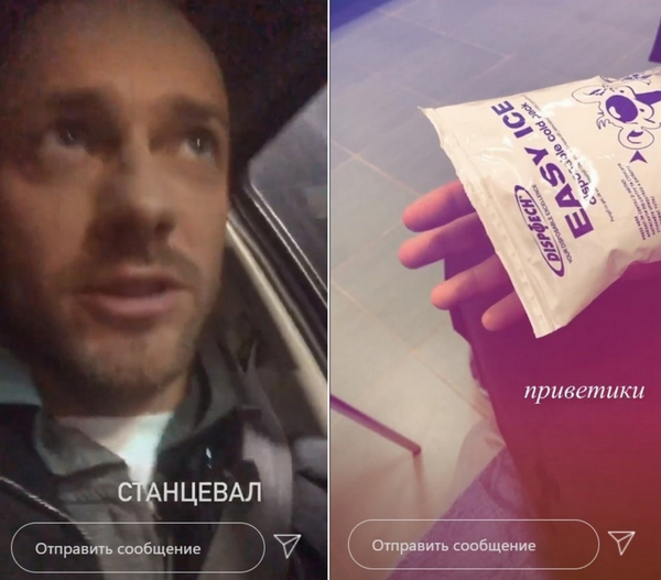 Далее в "сториз" хореографа появилось еще одно видео, на котором он приложил лед к руке, при этом шевелил всеми пальцами, что может говорить об ушибе или незначительно травме.