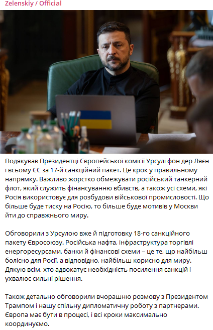 Зеленский поблагодарил Урсулу фон дер Ляйен и весь Евросоюз за принятие 17 пакета санкций против РФ и отметил, что это был шаг правильного вектора.