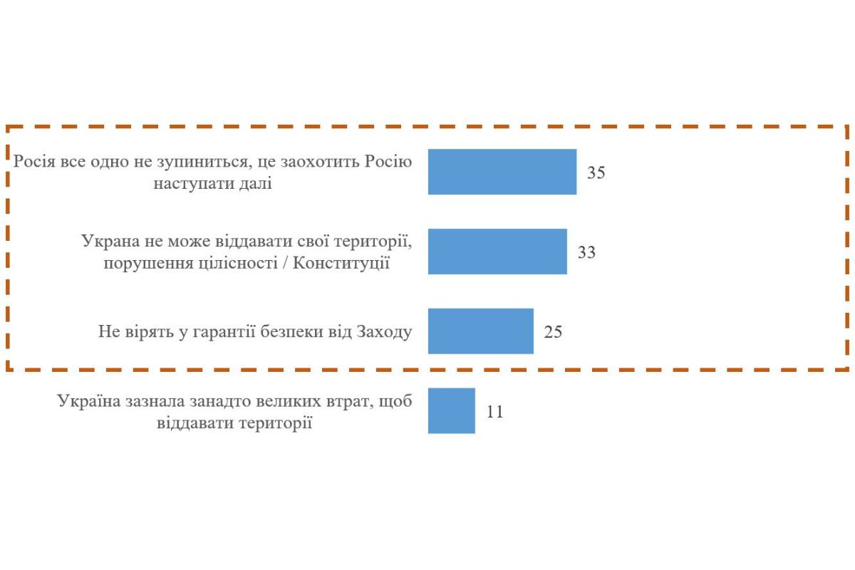 Также 33% опрошенных отметили невозможность отказа от территорий и людей, ссылаясь на Конституцию и территориальную целостность страны. Еще 25% респондентов не верят в реалистичность гарантий безопасности от Запада, вспоминая невыполнение Будапештского меморандума.