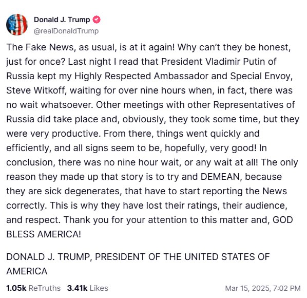 "Фейковые новости, как обычно, снова взялись за дело! Почему они не могут быть честными, хотя бы раз? Вчера вечером я прочитал, что путин заставил моего многоуважаемого посла и специального представителя Виткоффа ждать больше девяти часов, хотя на самом деле никакого ожидания не было. Состоялись и другие встречи с другими представителями России, и, очевидно, они заняли некоторое время, но они были очень продуктивными. С этого момента все пошло быстро и эффективно, и все признаки, как я надеюсь, очень хороши! Еще раз: не было никакого девятичасового ожидания или вообще никакого ожидания!", - говорится в сообщении.