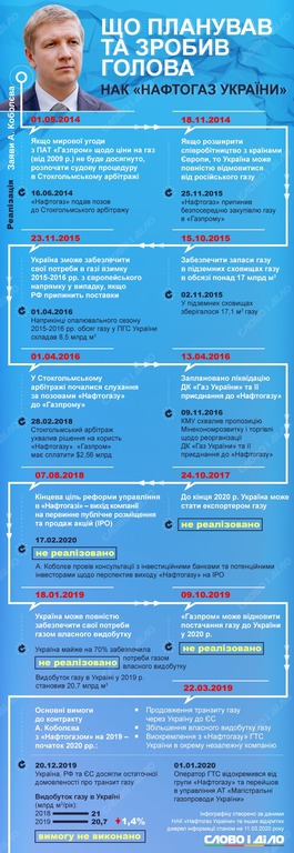 Среди выполненных дел и обещаний: "Нафтогаз" подал иск в Стокгольмский арбитраж через судебные споры с "Газпромом", "Нафтогаз" прекратил непосредственные закупки газа у "Газпрома", в подземных украинских хранилищах – более 17 кубических метров газа.