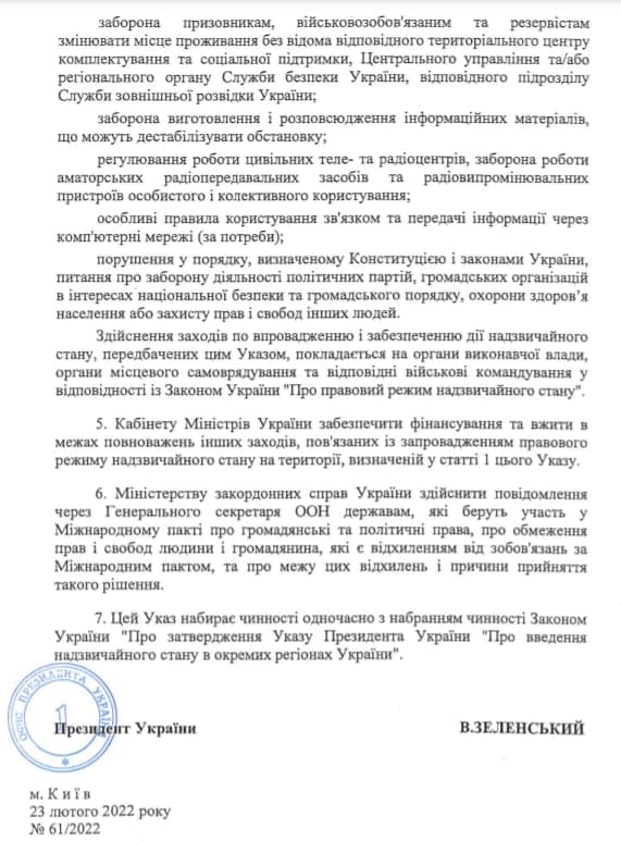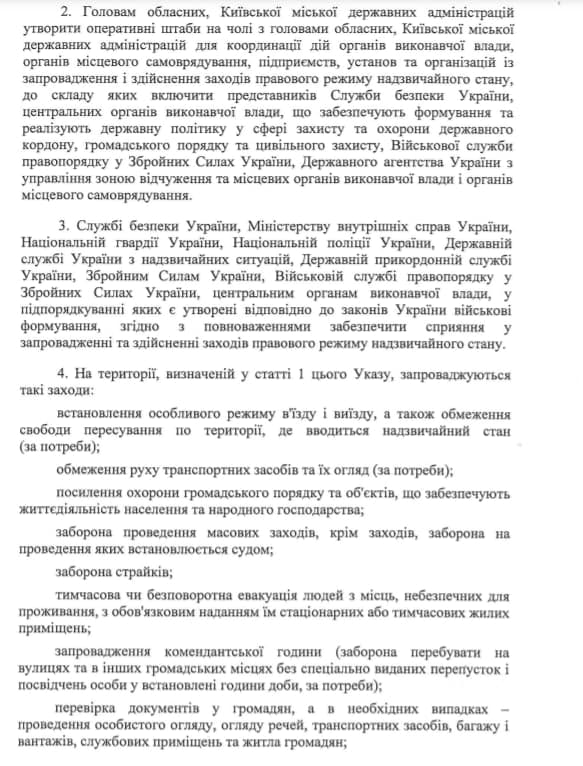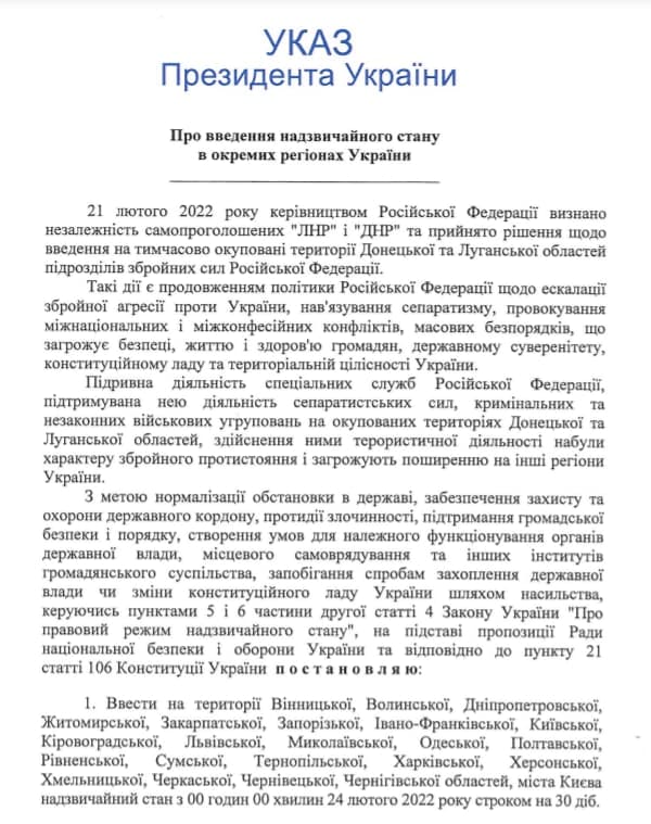 В тексте документа идет речь о введении режима чрезвычайного положения в 22 областей, а также города Киева. Это Винницкая, Волынская, Днепропетровская, Житомирская, Закарпатская, Запорожская, Ивано-Франковская, Киевская, Кировоградская, Львовская, Николаевская, Одесская, Полтавская, Ровенская, Сумская, Тернопольская, Харьковская, Херсонская, Хмельницкая, Черкасская, Черниговская и Черновицкая области - режим вводится на 30 дней начиная с 00:00 часов, 24 февраля.