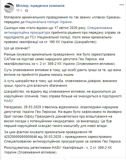 Отмечается, что 17 апреля Специализированная антикоррупционная прокуратура приняла решение о передаче дела по подследственности в ГСУ Национальной полиции, после изменения уголовно-правовой квалификации с ч. 2 ст. 369-2 УК Украины (злоупотребление влиянием) на ст. 190 УК Украины (мошенничество).
