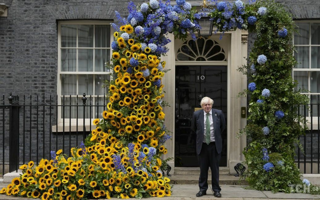 Борис Джонсон поздравил украинцев на фоне сине-желтых цветов на своей резиденции.