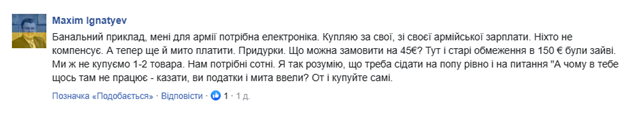"Банальный пример: мне для армии нужна электроника. Покупаю за свои, из своей армейской зарплаты. Никто не компенсирует. А теперь еще и пошлину платить. При*урки. Что можно заказать на 45€? Здесь и старые ограничения в 150€ были лишние. Мы же не покупаем 1-2 товара. Нам нужны сотни. Я так понимаю, что нужно садиться на попу ровно и на вопрос "А почему у тебя что-то там не работает – говорить, вы налоги и пошлины ввели? Вот и покупайте сами", – прокомментировал военнослужащий Максим Игнатьев.