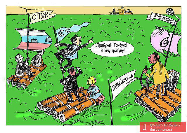 Так, автор карикатуры показал, как представители фракций "Голос", "Батькивщина", "Оппозиционная платформа - "За жизнь" и "Европейская солидарность" пытаются пробиться к трибуне, чтобы взять слово. Пробиваются они по воде, окрашенной в зеленый цвет - цвет партии "Слуга народа".