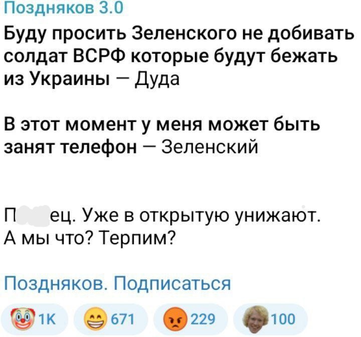 В этом контексте представитель Украинской добровольческой армии "Юг" Сергей Братчук опубликовал комментарий одного из российских пропагандистских пабликов, в котором россияне уже начали жаловаться на это унижение от польского президента.