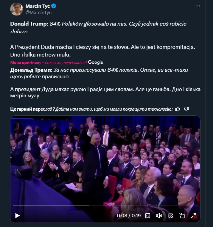 "Открыто заявляли, что только Трамп может закончить эту войну, потому что он сильный и решительный, а не то, шо Байден. Когда начались нападения Трампа на Зеленского, Дуда написал в твиторе, что вообще-то Зеленский должен закрыть рот и согласиться на все, что требуют США, - вспоминает журналистка и цитирует слова польского лидера: - "Потому что без США Украина не переживет войну", - заявлял Дуда".