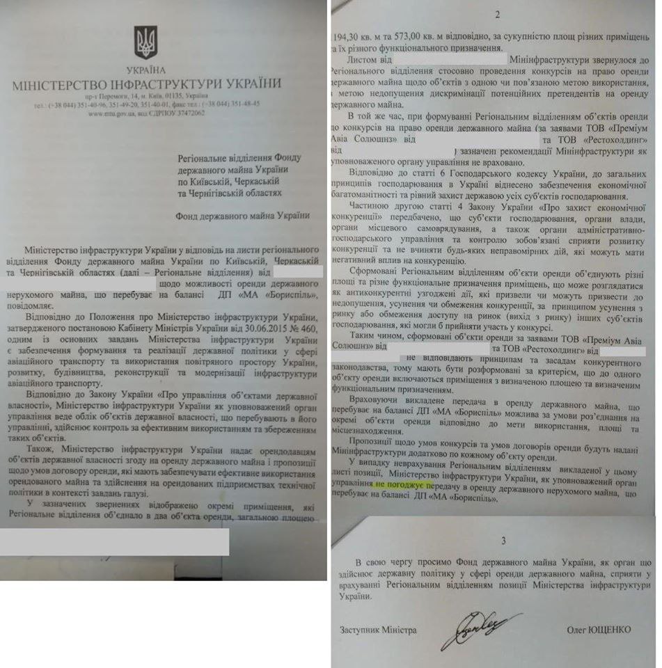 "В письме ФГИ от Мининфраструктуры, которое подписанно новым заместителем Криклия - Олегом Ющенко, говорится: "Учитывая изложенное, передача в аренду государственного имущества, находящегося на балансе ГП "МА "Борисполь", возможна при условии разъединения на отдельные объекты аренды в целях использования, площади и местонахождение". Создается впечатление, что чтобы легче было протянуть сдачи площадей Иванчуку, Криклию и Сенниченко их хотят раздробить на более мелкие", - подчеркнул эксперт.