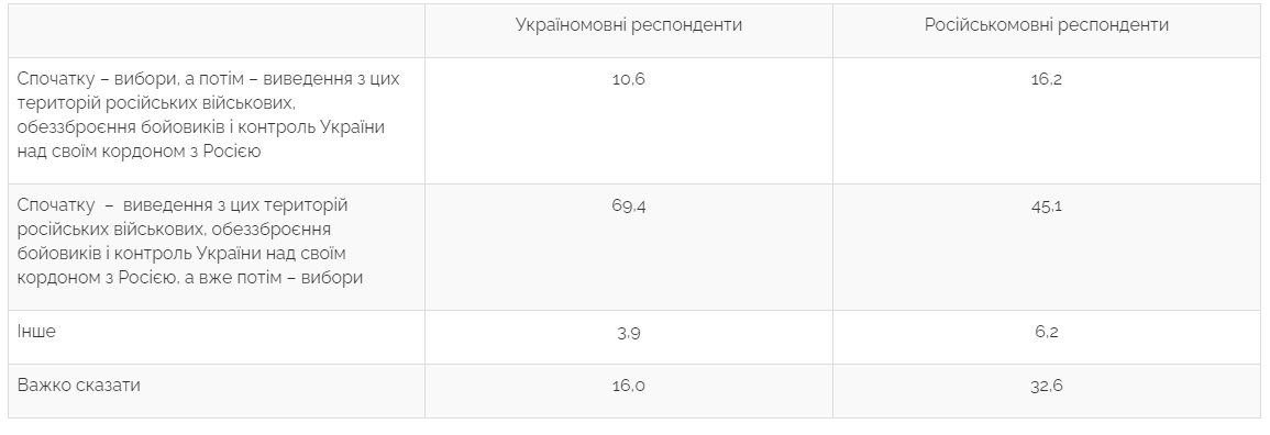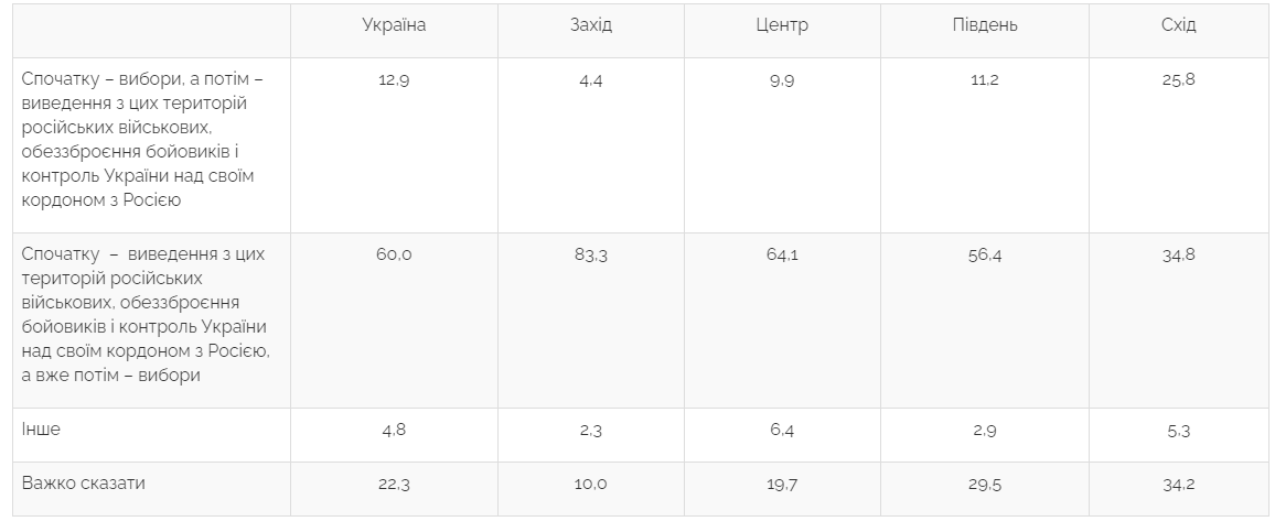 За то, что перед выборами сначала должен произойти вывод российских силовиков, большинство респондентов на Западе (83%), в центре (64%) и на Юге (56%) Украины. Относительное большинство, кто придерживается противоположной точки зрения, на Востоке (35%, при 26% тех).