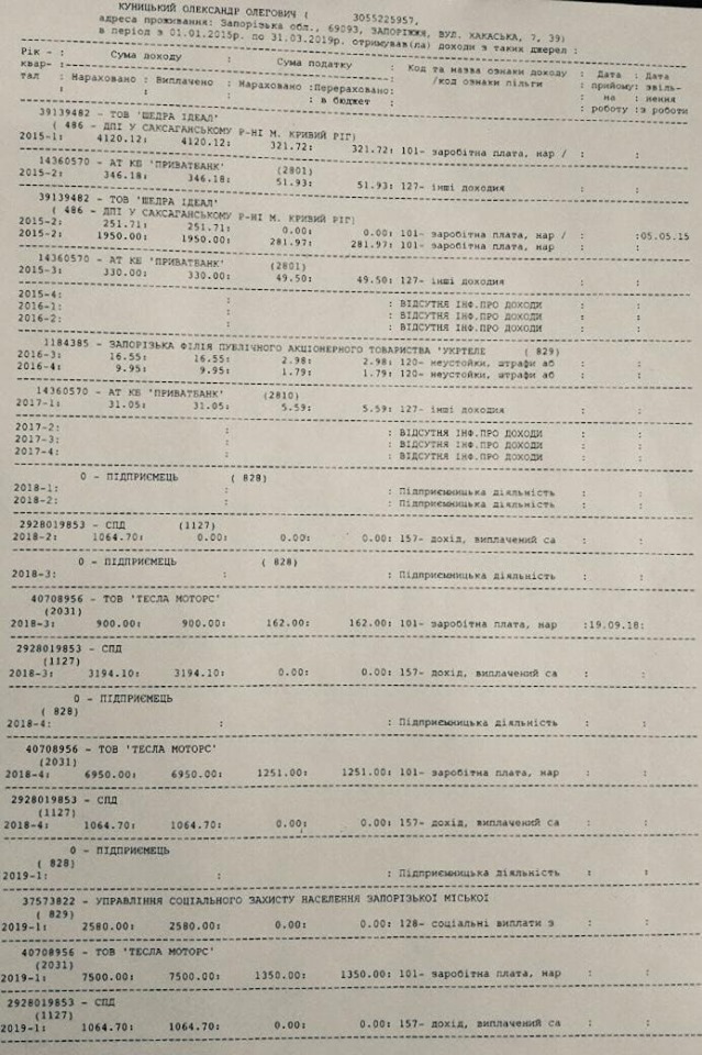 "Скандал с кандидатом в народные депутаты от "Слуги народа" Александром Куницким, похоже, только начинается. Ранее ЦИК своим постановлением сняла кандидата с выборов в связи с нарушением необходимого срока беспрерывного пребывания в Украине за последние пять лет. Пытаясь оправдать свое отсутсвие, Куницкий изначально сослался, что перебывал в командировке по редакционным закланиям "1+1 продакшин" и ГО "Элита Нации". Однако, в сети появилось фото документа из ГФС, где якобы видно, что Куницкий не получал никаких доходов от "1+1 продакшин" в указанный период, а соответственно не мог быть в служебной командировке от плюсов", - пишет Марунич.
