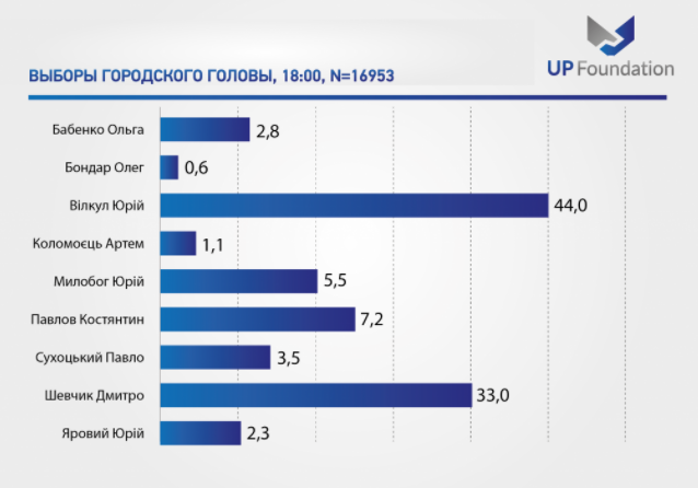 На выборах городского головы 44% избирателей отдали голоса за действующего мэра Юрия Вилкула, 33% - за выдвиженца "Слуги народа" Дмитрия Шевчика. Окончательный исход выборов решится во втором туре 15 ноября. Опрос проводился на выходе из избирательных участков по Венской методике.