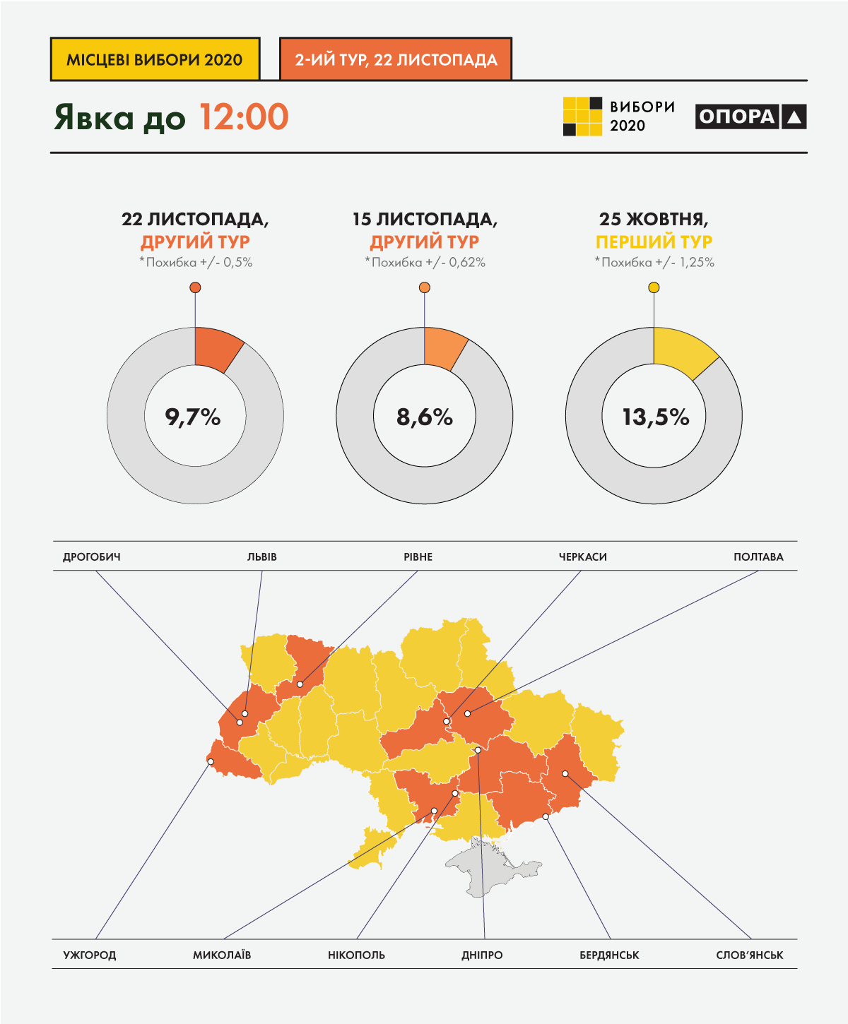 Как сообщается, Гражданская сеть ОПОРА проводит кампанию наблюдения за повторным голосованием на выборах городских голов в 11 городах: Бердянск (Запорожская область), Днепр, Дрогобыч (Львовская область), Львов, Николаев, Никополь (Днепропетровская область), Полтава, Ровно, Славянск (Донецкая область), Ужгород, Черкассы. В день голосования, 22 ноября, на участках присутствуют почти 300 наблюдателей сети.