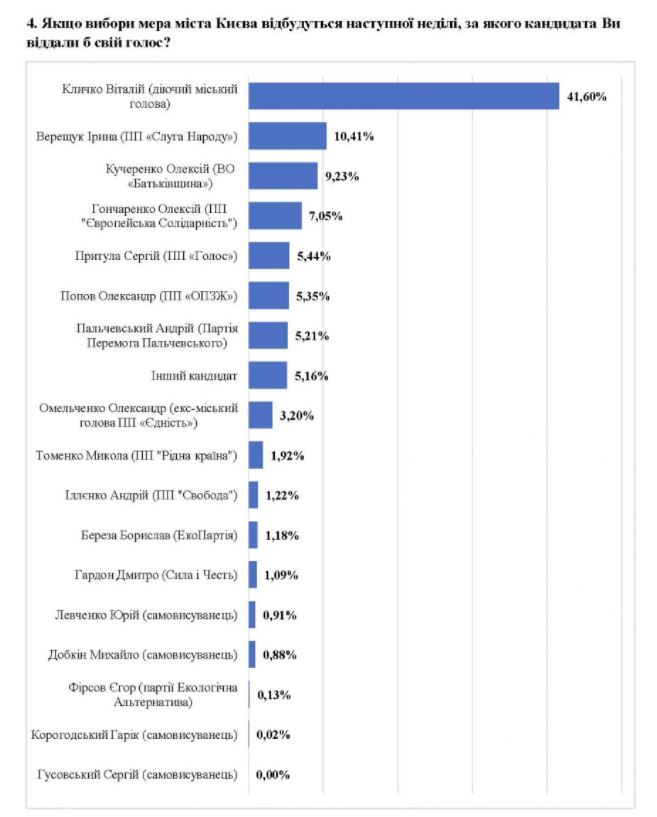 Данные ВОО "Передовые правовые инициативы" в августе демонстрирует сохранение жителями Киева своих предпочтений - за действующего городского главу Киева Кличко готовы проголосовать 41,6%. Кандидат от "Слуги народа", народный депутат Ирина Верещук занимает вторую строчку – 10,41%. Всего 1% от Верещук отделяет нового кандидата в мэры Киева Алексея Кучеренко. На четвертой позиции находится народный депутат от "Европейской солидарности" Алексей Гончаренко – он набирает 7,05% голосов.